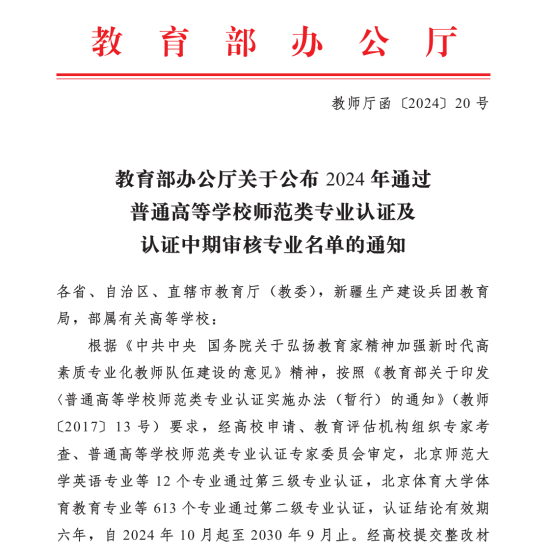 2024/11近日,教育部办公厅发布《关于公布2024年通过普通高等学校师范类专业认证及认证中期审核专业名单的通知》(教师厅函﹝2024﹞20号)。2024年全国共有6所高校的12个专业通过教育部师范类专业第三级认证,其中包含我校历史学专业,认证结论有效期六年,自...
