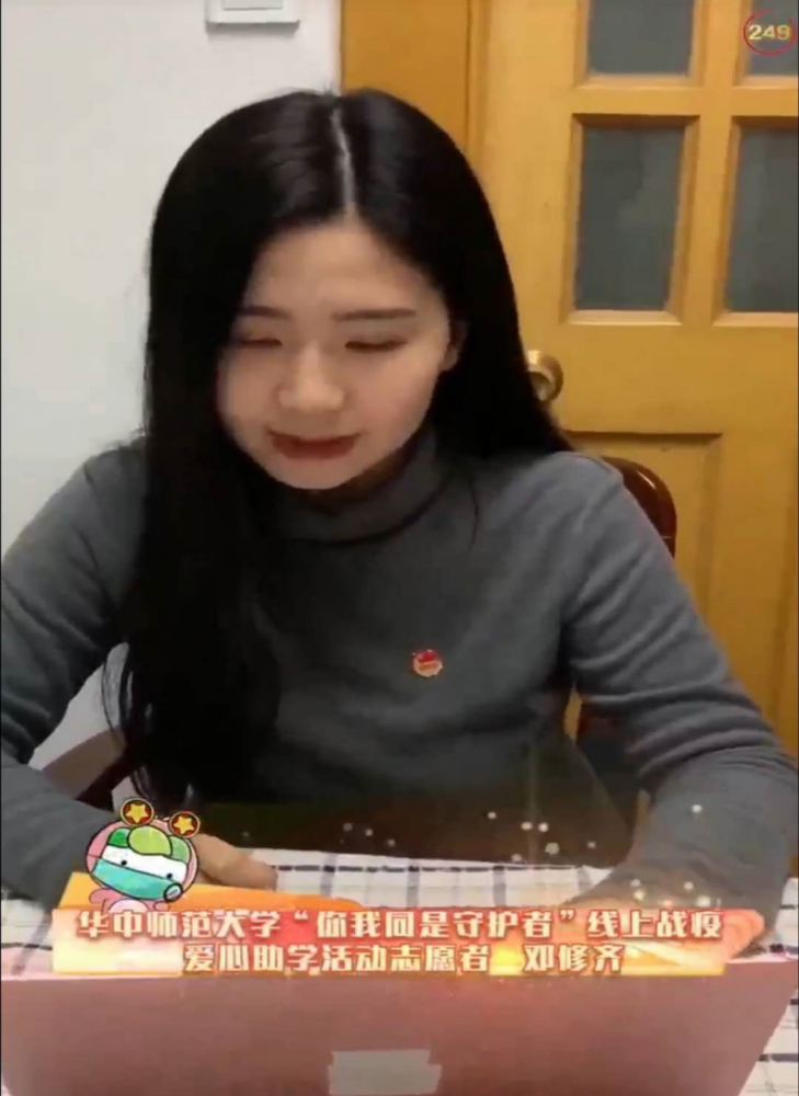 于是,她毫不犹豫地报名参加了华中师范大学“你我同是守护者”线上战疫爱心助学活动,一对一线上帮扶武汉抗疫一线医务人员子女。她对接的是一名新洲区的初三学生,根据学生的需求,她通过屏幕共享、语音聊天等方式进行英语、语文等学科的辅导。每次辅导结束,帮扶对象的感谢让她切实感受到了自己的付出给对方提供了帮助。她认为,尽管自己无法同医护人员一样奋战在抗击疫情一线,但通过辅导他们子女的学业,也一定程度上为他们缓解了后顾之忧。
