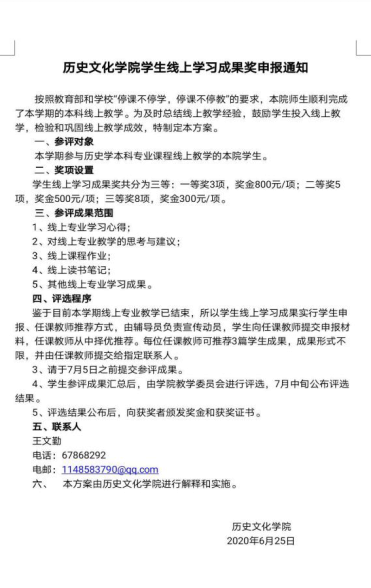 为及时总结线上教学经验,巩固教学成效,我院于6月25日发布了《历史文化学院学生线上学习成果奖申报通知》,得到了广大师生的积极响应与参与,主动分享自己线上学习的心得经验。本次评选活动的主要对象是本学期参与历史学本科专业课程线上教学的本院学生,评选程序主要分学生自主申请、任课教师推荐、学院教学委员会评审三个阶段进行,学生提交的学习成果可以是多样的,包括线上专业学习心得、对线上专业教学的思考与建议、线上课程作业、线上读书笔记以及其他线上专业学习成果。此次活动有100余位同学积极参与,经任课老师推荐,共有48位同学的学习成果进入最终评审。经学院教学委员会认真审议,确定相云飞、李睿诗、张云飞3位同学获得一等奖,褚芝琳、莫倩兰、赵雨萌、龚颖、白菲菲等5位同学获得二等奖,左雨舟、朱汉杰、蔡伟玲、麻小芬、朱璇、张梦娇、张雷阳、李思雨等8位同学获得三等奖,学院将在下学期开学后为获奖学生颁发奖金与获奖证书。