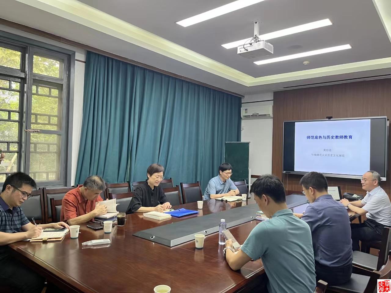 2024年6月24日下午,历史文化学院第三期创新发展论坛在西一办公楼319会议室举行。本期主题为“师范底色与历史教师教育”,邀请了华南师范大学历史文化学院副院长黄珍德教授担任主讲人。历史文化学院院长魏文享教授、正处职组织员纪红老师、党委副书记梁方勇老师、历史系主任罗爱林教授和中学历史课程与教学论教研室主任向佐军副教授等参与讨论。活动由历史文化学院副院长尤学工教授主持。