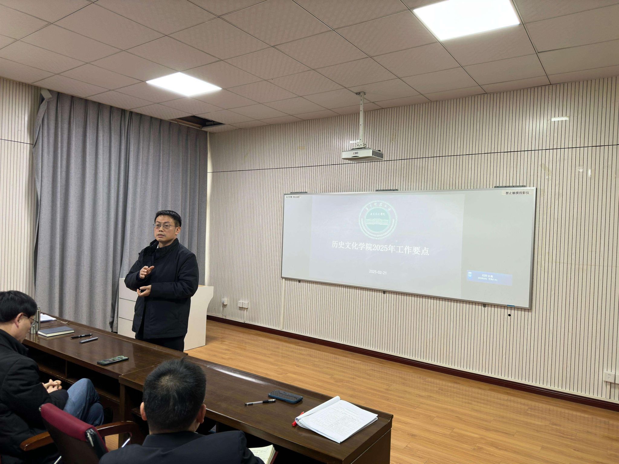 会上,院长魏文享结合学校2025年工作要点,详细阐述了学院2025年工作重点。他强调,2025年要贯彻落实党的二十届三中全会精神和全国教育大会精神,对标“一流学科”战略目标,完善拔尖创新人才培养体系,深入推进有组织科研。重点围绕党建及思想政治建设,学院综合治理,人才培养,科学研究,社会服务,学术交流等十二项工作展开,推动学院事业高质量发展。