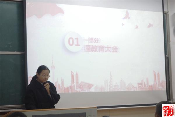在张靖宇同学进行了简洁明了的会议介绍后,王一凤同学随后上台,进行了关于全国教育大会精神和教师教育振兴计划行动两个方面的内容的分享,着重强调了大会精神八个“一”和六个下功夫,并且介绍了全国教育大会对高校的意义,讲述了教育振兴行动计划以及新形势对有志于从事教师职业的同学们的挑战。