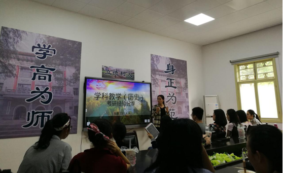随后,已成功考研至本校学科教学(历史)专业的15级基地班的张健也就自己准备考研的过程和相关经验与在座同学进行了交流与分享。她从专业选择、前期准备、各科复习等方面介绍了自己的考研历程,就其自身经验给学弟学妹们分享了一些关于学科教学方向考研的注意事项,详细介绍了复习过程中的具体准备,提到了搜集、整理信息以及专业复习的重要性,同时,她建议学弟学妹在备考过程中要保持良好的心态。此外,她还为同学们推荐了一些考研相关的公众号,鼓励学弟学妹们要善于利用网络资源。