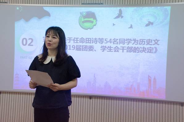 在钟佩文老师做了简单介绍后,本次团委与学生会成员任命大会正式拉开帷幕。首先,学院党委副书记康薇宣读了《关于任命田诗等54名同学为历史文化学院2019届团委、学生会干部的决定》,康书记勉励2019届团委与学生会全体成员勤奋学习、努力工作,发扬优秀传统,创新工作模式,争做一流学生骨干,争创一流团学组织,为我院学子成才和学院发展贡献力量。