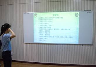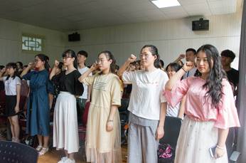 最后,团委学生会成员共同宣誓并合影留念,本次大会圆满结束。会后,宣传组组长赵婧雯同学表示,此次活动意义重大,不仅使大家增强了责任意识和使命意识,还加强了各部门之间的联系,我们将紧密配合,精诚团结,为历史文化学院团学发展贡献力量!