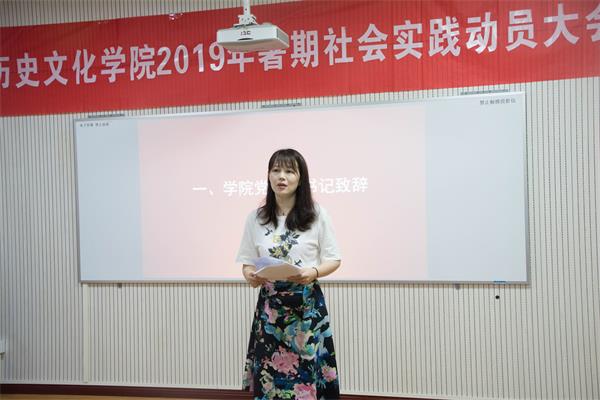 紧接着,学院党委副书记康薇上台致辞。她表示,暑期社会实践作为一项重要的实践育人活动,是学院第二课堂教育的重要组成部分,它充分体现了学校要求、学院特色以及学生的创意与选择。康书记鼓励学生们做到知行合一、严谨务实,并以党中央开展的“不忘初心,牢记使命”主题教育活动为指引,向支教成员们提出了三点希望:一是明确青年学子的责任与担当,将实践活动融入时代大潮,与国家发展、民族大业同向同行;二是传承百年华大精神,展示华师风范与史学品格,以实践活动助力学校发展;三是树立成为拔尖创新的一流史学人才的目标,在实践活动中体察世间冷暖、民众忧乐、现实矛盾,并从中寻找现实价值。