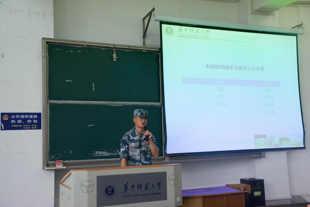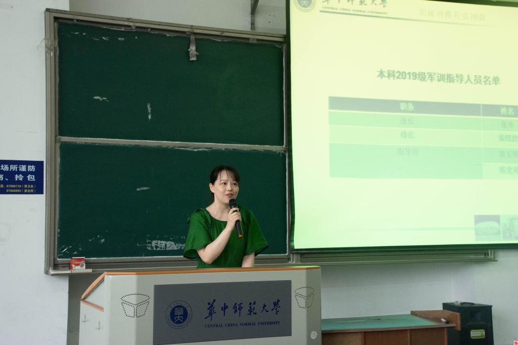 会议伊始,辅导员秦玉琴对19级新生表示热烈的欢迎, 并一一介绍了与会嘉宾和会议流程。随后,党委副书记康薇上台致辞,她代表学院向新生表示欢迎并向教官表示敬意。同时她向新生提出了三点要求:首先,同学们应尽快融入大学校园;其次,应珍惜时光,细心品味大学生活;最后,在军训中应当发扬党与部队的优良传统,展华师风貌。