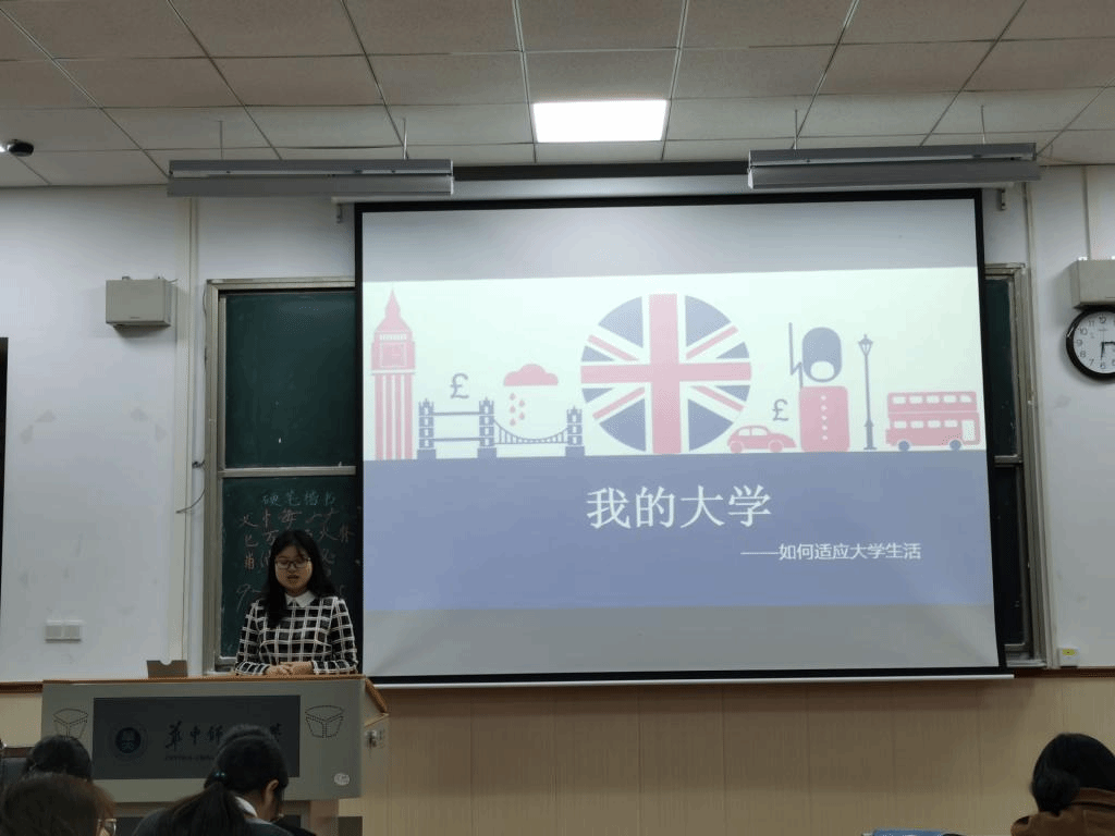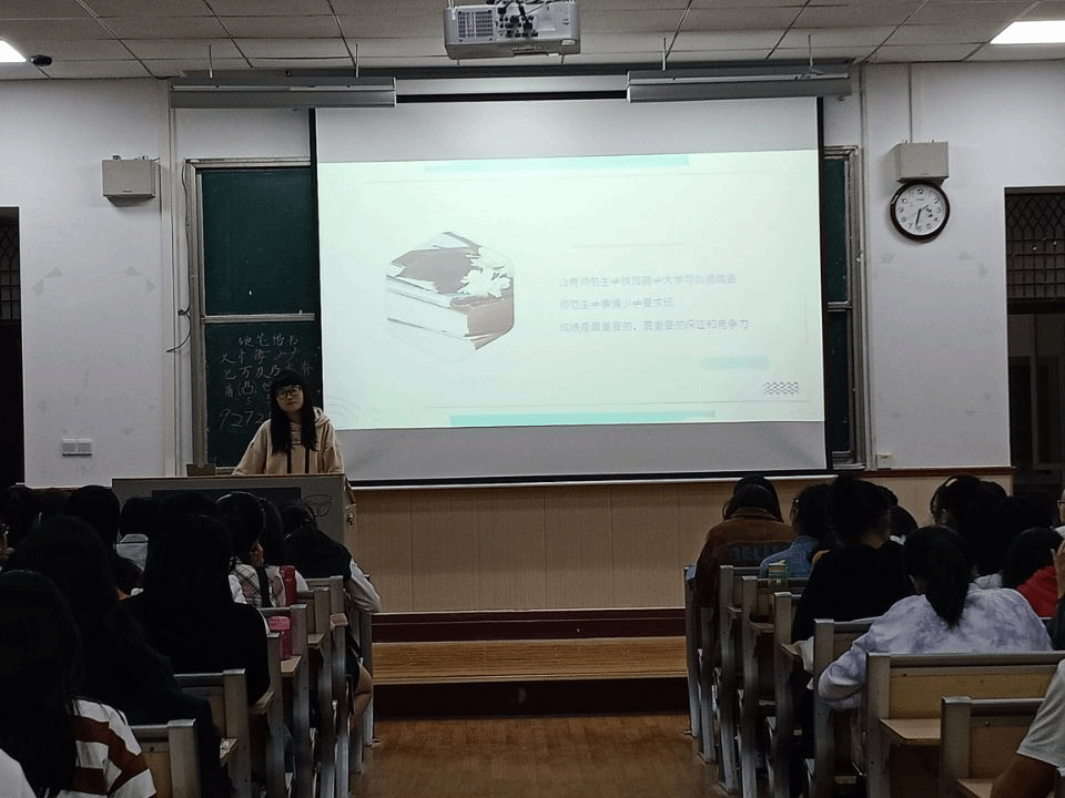 接着,莫倩兰带来了她的经验分享。开篇,莫倩兰点明了几大误区:公费师范生不等于铁饭碗,也不等于大学可以很咸鱼;师范生不等于事情少,也不等于要求低;大学生生活不等于懒散,也不等于可以不学习。紧接着,在各类课程选择和学习方面,莫倩兰着重进行了讲解,为19级新生答疑解惑。最后,她简单介绍了课余安排的内容并给出了几点小建议:第一,多看书,多交友,抓住大一的珍贵时间;第二,提前安排,减少拖延;第三,适当焦虑和必要娱乐,多参加一些有意义的活动。分享最后,莫倩兰送给19级新生一句话“天道酬勤,功不唐捐”以激励新同学们。
