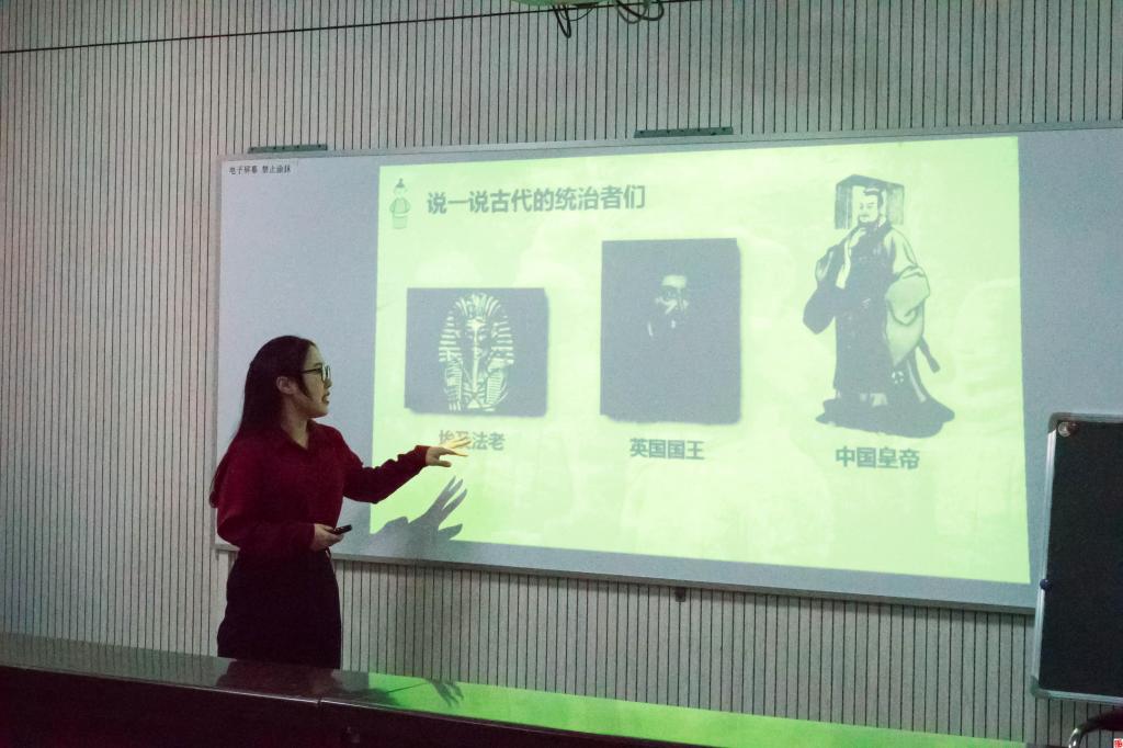 评委简单评论后,紧接着3号选手李玲洁以“‘百家争鸣’和儒家思想的形成”为题进行试讲,她有趣的互动成功调动了整个课堂氛围。随后基地班的4号选手李丽讲解的主题是“文艺复兴和宗教改革”,与师范生选手相比,李丽更显紧张,但是她勇于尝试和挑战自己得到评委与观众的一致好评。