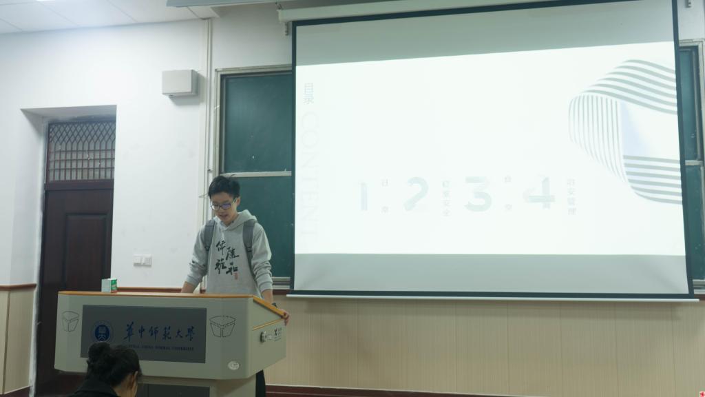 主持人开场后,朱天硕进行了简单的自我介绍,其后宣讲正式拉开帷幕。他首先介绍了维权服务的日常工作,为新生讲解了四种物品丢失后的解决渠道。同时,他还强调了预防的重要性,日常生活中同学们要看管好自己的物品,起身离座时要回身检查个人物品是否有遗失。这些实用的建议对于新生有很大的帮助。随后他展示了校维服中心在上学期的工作成果,体现了校维服中心在维护华师学子权益方面的积极作用。