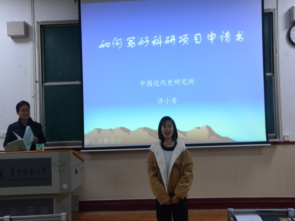 接下来他讲解了撰写课题报告的核心——研究内容,建议同学们界定好研究对象,安排好总体框架,点明重难点的同时明确主要目标,为有意于申报课题的同学们指明了方向。随后他介绍了研究思路、方法的采用和参考文献的选取原则,建议同学们选取权威和前沿的研究文献进行参考,尽量选用一手的资料文献,注意文献种类的多样性,以增强论证的科学性、准确性。最后,许小青以历院老师的选题“近代汉口商会研究”为例,具体阐明了课题撰写的各项要求,使同学们有了一个更深刻的理解。