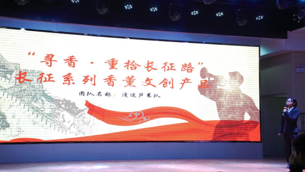 接下来出场的队伍展示的产品及设计各有特色。长征小队将长征文化与游戏相结合,设计了“‘重启长征’情景交互体验游戏”;“共产者联盟”团队设计的面向学生和红军长征爱好者的小程序让大家深入理解了长征文化;红红火火队的“将军故里,铁血之乡”红安县红色旅游概念设计让同学们对于苏区圣地红安县的背景及相关信息有了进一步的了解;而“漫途芦苇”团队则从味道的独特角度向大家分享了他们的 “寻香·重拾长征路”长征系列香薰文创产品,着重介绍了他们四款香薰的味道、内外包装设计及附属产品。在答辩环节,评委老师们针对各个作品的创作理念、特色与不足分别进行了点评,各小组成员也一一作了回答和说明。