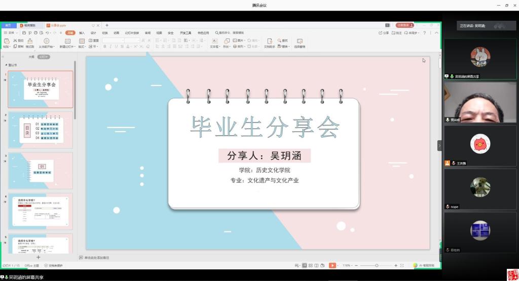 2020年7月6日下午,受疫情影响,2020届文遗班毕业生经验交流会以在线视频方式举行。文化学系系主任黄尚明教授主持会议,王洪强、王闯两位文遗班班主任老师出席。会议邀请2016级6位同学分享各自在保研、考研、出境留学等方面的经验,2017级、2019级文遗班近40位同学参与交流。