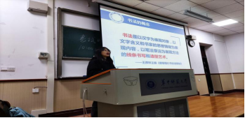 培训伊始,康海燕以“书法是什么”这一问题引出了书法的概念,即以文字含义和书家的思想情绪为表现内容,以笔法章法为表现方法的线条书写和造型艺术。在简单介绍完这一概念后,康海燕又从书写工具、书写体裁和书写技巧等方面为同学们辨析了硬笔和软笔这两种书法的不同,接着她展示了多幅硬笔和软笔书法名家之作,让同学们对二者有了更直观的了解。
