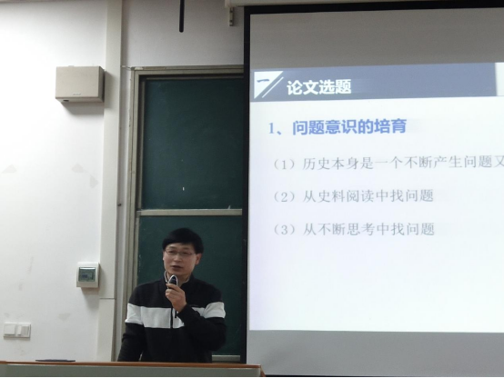 接下来,尤学工教授分别从论文选题、研究综述撰写、论文撰写与规范四个方面,对“如何进行史学论文写作”的问题进行了详细而深入的讲解。在论文选题上,尤学工教授着重强调了“问题意识的培养”。他表示,历史本身是一个不断产生问题又不断解决问题的过程,要学好历史,必须多读史料、不断思考,形成独立的学术判断能力,从中发现问题。在此基础上,尤学工教授提出了“集大成”、“开先河”、“接着说”、“对着干”四种不同类型的选题方向,并结合学术动态,对于四种选题进行了深入解读。