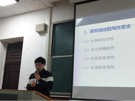 接着,尤学工教授讲授了论文撰写中各个部分的要求。在拟定论文题目方面,尤学工教授强调拟题的具体性、准确性、鲜明性和简练性,并提出“拟题十戒”,以供同学们参考。此外,尤学工教授还提示同学们,在撰写论文的实践过程中“只有共同的要求,没有共同的程序”,应结合自身具体情况,根据个人撰写论文的习惯进行合理规划,同时还应做到概念清晰、逻辑严谨、集中时间、速战速决。