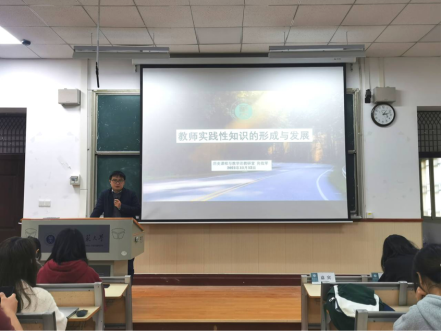 活动第四项,向佐军老师作为“教师实践性知识的形成与发展”主题讲座的主讲人,向同学们介绍了在训练过程中对实践性知识应有哪些思考。他从教师实践性知识的概念入手,探讨了培养实践性知识的必要性与具体路径。他表示,在“迈向名师”的过程中,教师实践性知识培养是十分重要的,具体而言我们可以通过实训、见习、研习与实习发展实践性知识。他指出,当下同学们处于实训阶段,需要充分利用网络资源,充分发挥同伴互助学习作用,提升自身教学实践,真正从理论走向实践。讲座进入尾声,向老师还提醒同学们:“虽然教学天赋有高下之分,但更重要的一点还在于对教学的态度。因此不管是当下还是未来,钻研才是迈向名师的切实路径。”
