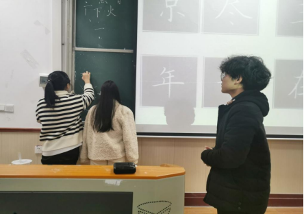 张景乔首先以提问的方式带领大家回顾了构成汉字的基本笔画:点、横、竖、撇、捺、钩、挑、折。在详细讲解笔画时,他以一些典型笔画和汉字为例,让同学们进行练习,同时多次请同学上台书写,并针对他们的问题提出了改进意见。根据同学们练习的情况,张景乔指出易错点,并在黑板上进行演示,对每个笔画进行了细致入微的分析与讲解。