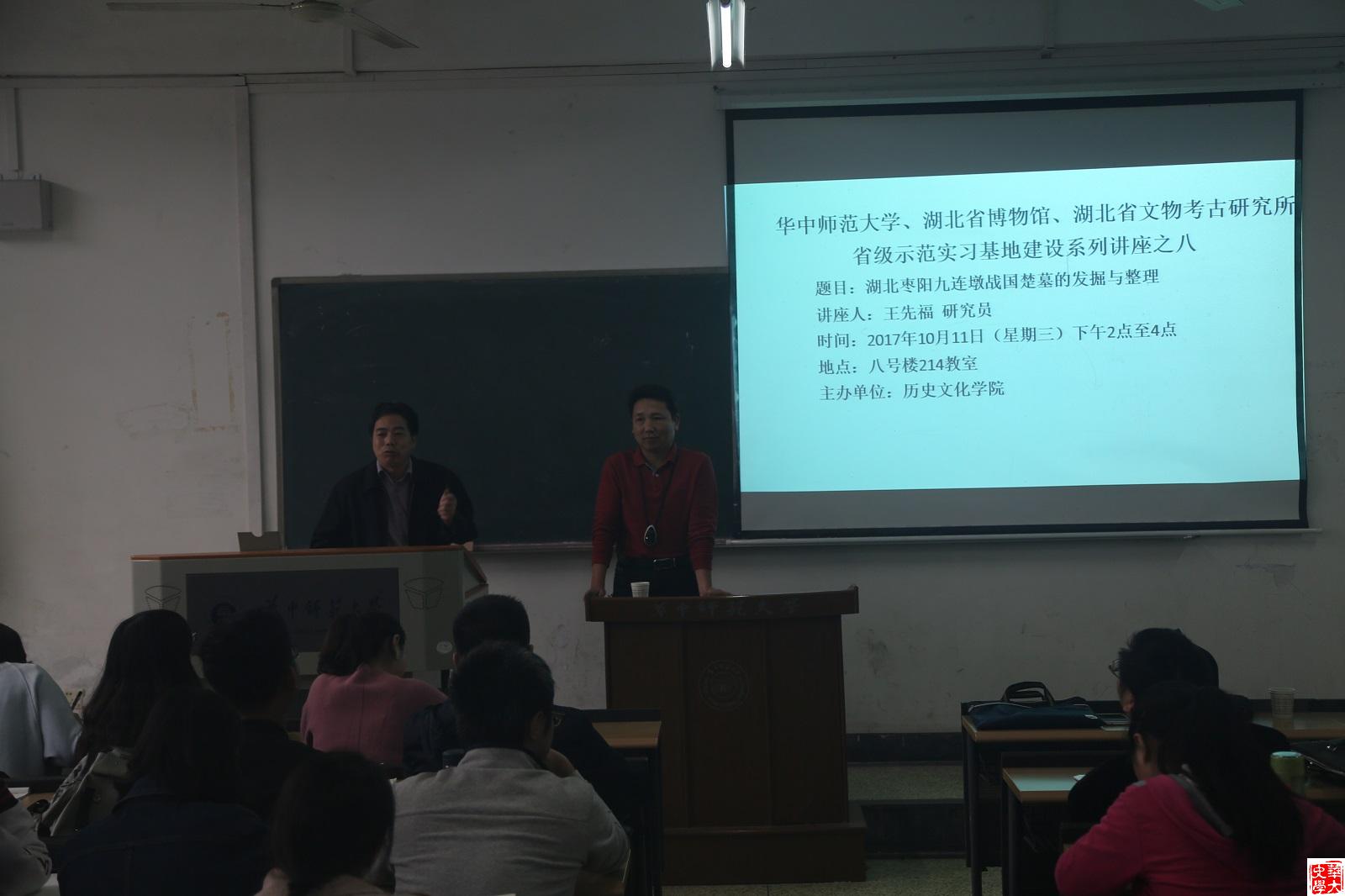(通讯员 钱薛芳)2017年10月11日下午2点,华中师范大学、湖北省博物馆、湖北省考古研究所省级示范实习基地建设系列讲座之八在华中师范大学八号楼二楼214教室举办,特邀湖北省博物馆副馆长、湖北省文物考古研究所副所长王先福研究员为我校师生作了《湖北枣阳九连墩战国楚墓的发掘与整理》的学术讲座,近百师生前来听讲。讲座由华中师范大学历史文化学院主办,楚学所所长、文化学系主任黄尚明教授主持。