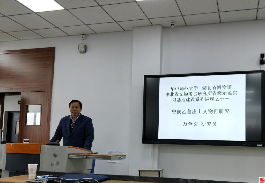 (通讯员杨蕾)2018年12月5日下午2点,华中师范大学、湖北省博物馆、湖北省文物考古研究所省级示范实习基地建设系列讲座之十一《曾侯乙墓出土文物再研究》在华中师范大学八号楼四楼410教室举办。本次讲座由华中师范大学历史文化学院主办,特邀湖北省博物馆研究员、党委书记兼常务副馆长万全文研究员主讲,楚学研究所所长、文化学系主任黄尚明教授主持。讲座吸引了不少博士、硕士研究生和本科生前来聆听。