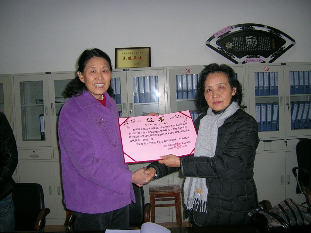 捐赠仪式由楚学所所长蔡靖泉教授主持。蔡靖泉教授首先向大家介绍了张正明先生在去年手术前的一些经历,以及先生逝世后学院为先生藏书的交接所做的努力。先生生前交代:身后自己的所有藏书将无偿捐赠给华中师范大学历史文化学院,以供楚学与区域文化研究以及培养后备人才之用。先生病故后,根据先生遗愿,楚学所着手准备交接,为此院里相当重视,在办公室相当紧张的交件下专门安排了房间作为先生捐赠图书的资料室,并购置了书柜以供陈列。楚学所的研究生为张正明先生的图书作了编目、分类与索引,此次捐赠图书共计1687种。