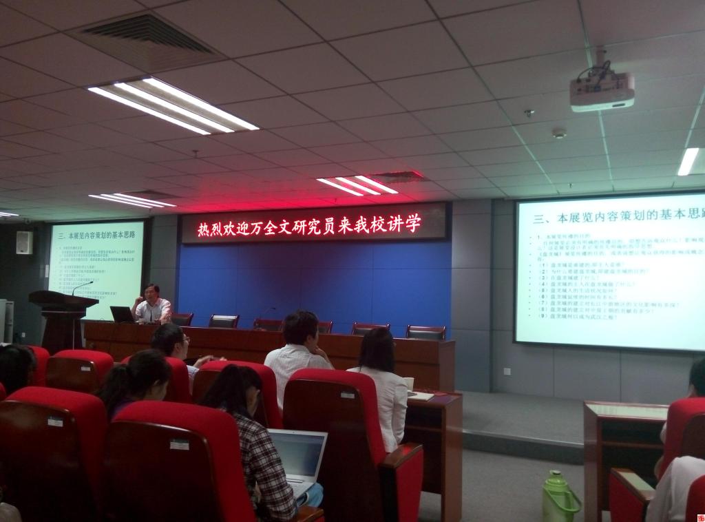 万全文研究员是湖北省博物院研究员、党委书记兼常务副馆长,主要从事博物馆学、中国古代青铜文化、楚文化研究等。首先,他讲述了博物馆的展览策划,并对博物馆展览进行介绍,万全文研究员对展览的类型、内容作了详细介绍,展览时候的陈列物品的选择需要经过仔细斟酌,他谈到展览内容的策划是极其重要的。对主题提炼、主题内容、重点亮点规划上,都要进行认真思考。目前湖北省博物馆还在整修,在接下来的时间将会举办一些较为有吸引力的展览。任何展览都必须有明确的传播目的,他以盘龙城为例,为大家介绍了这次展览的主要目的是让大家了解盘龙城、盘龙城的建立对长江中游地区的文化影响问题、中原王朝的建立产生的贡献如何等。万全文研究员以他自己熟悉的领域详细为大家介绍了博物馆的陈列与策划。