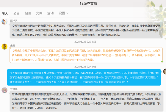 本次活动结束后,18级党支部预备党员们深有感触。其中,预备党员甘琳娜表示,“与18级的预备党员同志共同参观完中共五大会址、毛泽东故居和农讲所后,我仿佛真的切身实地地来到了那个时代,和毛泽东以及无数革命先辈一起,经历了那个时代的历史。一个时代有一个时代的主题,一代人有一代人的命运,革命先辈和无数先进的中国人为我们开辟了中国从站起来到强起来的道路,而今革命的火炬也由上一代中国人转交到我们手中,新时代的我们也将经历新的‘长征’,愿我们都能不忘初心,砥砺前行。”