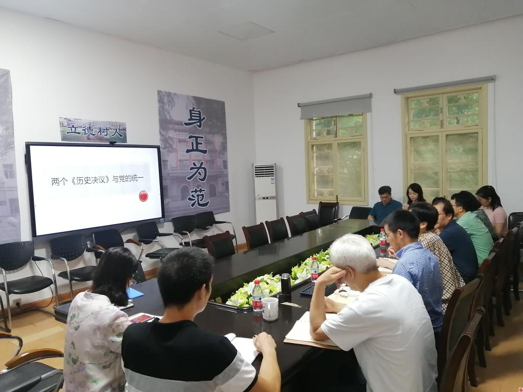7月2日上午,历史文化学院分党委在一号楼311会议室,开展七月份中心组(扩大)政治理论学习,政治理论学习采取讲专题党课的形式进行,由王龙飞老师做题为《两个历史决议与党的统一》的宣讲,会议由院党委书记纪红同志主持,院党委委员、教工党支部书记、辅导员和行政党支部党员参加。