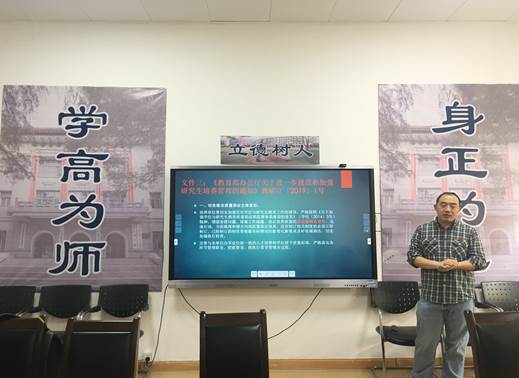付海晏以“立德树人、加强科研与研究生培养管理”为主题,带领大家学习《关于进一步弘扬科学家精神加强作风和学风建设的意见》、《教育部关于全面落实研究生导师立德树人职责的意见》、《教育部办公厅关于进一步规范和加强研究生培养管理的通知》、《华中师范大学关于全面落实研究生导师立德树人职责的实施办法》等四个文件的内容和精神。他指出,立德树人是教育工作者的根本任务,学院要结合一流学科建设的实际情况,以文件精神和要求为指导,将立德树人的理念贯彻到学院的学科建设和学生培养过程中去;研究生导师要有责任与担当,以德为先,真正成为学生成长成才的引路人,为祖国培养更多新时代优秀接班人。