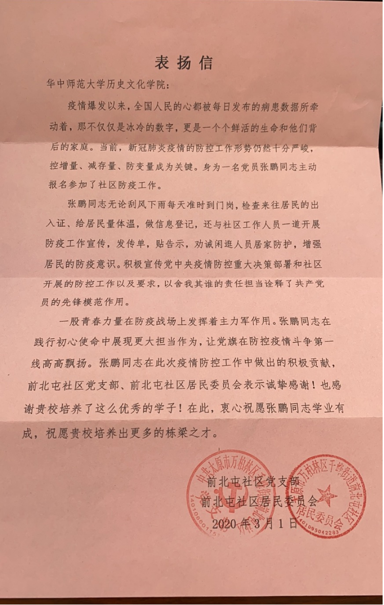 面对来势汹汹的疫情,张鹏同志用自己的赤诚与热情为社区居民生命安全保驾护航,以实际行动践行了一名共产党员的初心与使命。他的表现得到了太原市万柏林区千峰街道前北屯社区居民委员会的肯定,社区居委会主动向学院发来了对张鹏同志的表扬信,感谢张鹏同志在此次疫情防疫工作中为社区做出的积极贡献,为华师历院学子的家国情怀和大义之爱点赞。