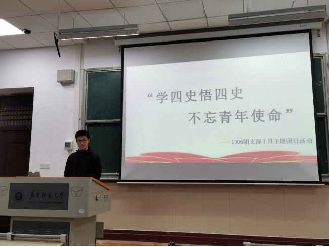 (通讯员:程维轩 摄影:程维轩)10月24日上午及晚上,历史文化学院1906团支部成员分别在武汉革命博物馆和1201教室举行了十月主题团日活动。武汉作为中国近代史上举足轻重的大城市,许多著名的历史事件都发生在这里。适逢此次活动以“学四史悟四史,不忘青年使命”为主题,因此团支部决定通过实地走访中国共产党农民运动讲习所旧址、毛泽东同志旧居和中国共产党第五次全国代表大会会址等地点来进一步了解“四史”,学习中共在革命斗争时期的历史和积极进取、艰苦奋斗的革命精神;通过团支部会议,系统梳理了“四史”的脉络,深入理解了中国特色社会主义的伟大事业。本次活动由1906团支部团支书袁泷晖主持,1906班班主任董恩强老师作为嘉宾出席。