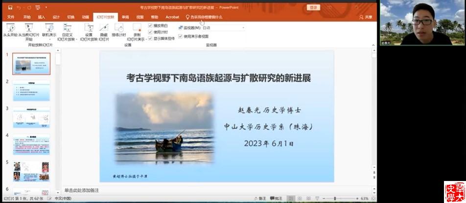 2023年6月1日上午10时,受华中师范大学历史文化学院文化学系及楚学研究所副教授傅玥老师的邀请,来自中山大学历史学系(珠海)的赵春光老师在腾讯会议上以网络授课的形式为“先秦考古”课堂的同学们做了一次关于“考古学视野下南岛语族起源与扩散研究的新进展”的专题讲座,引起同学们的积极响应。