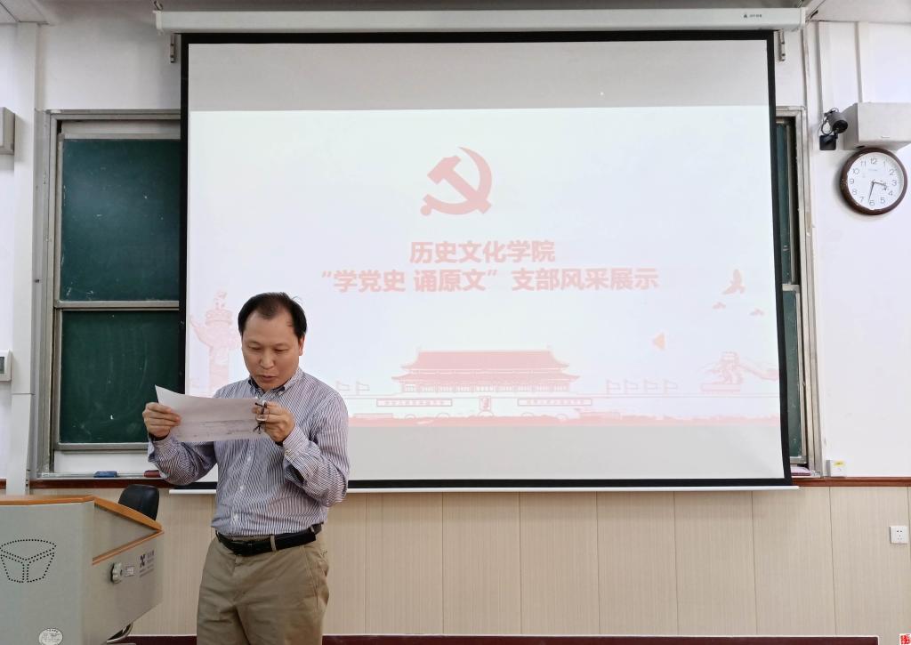 (通讯员蔡雨倩谭思思高成龙)4月30日,历史文化学院“学党史 诵原文”支部风采展示于历院1201教室举行。学校党委组织部副部长、党校副校长夏守信、历史文化学院党委书记纪红、正处级组织员周政华、党委副书记康薇、副院长付海晏、副院长尤学工、历史系主任罗爱林、工会主席许小青、近代史所党支部书记魏文享出席此次活动并担任评委嘉宾。全体辅导员、全体学生党员参与本次活动。2019级硕士生综合党支部邱晴担任活动主持人。